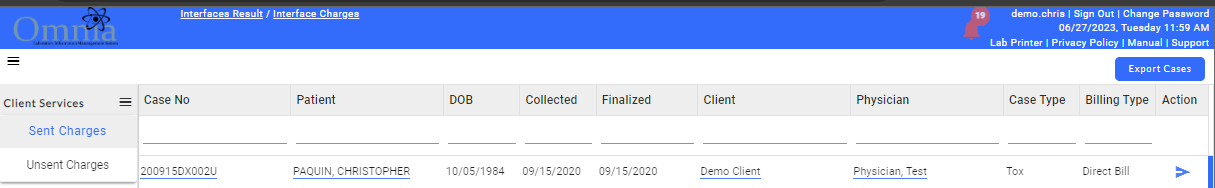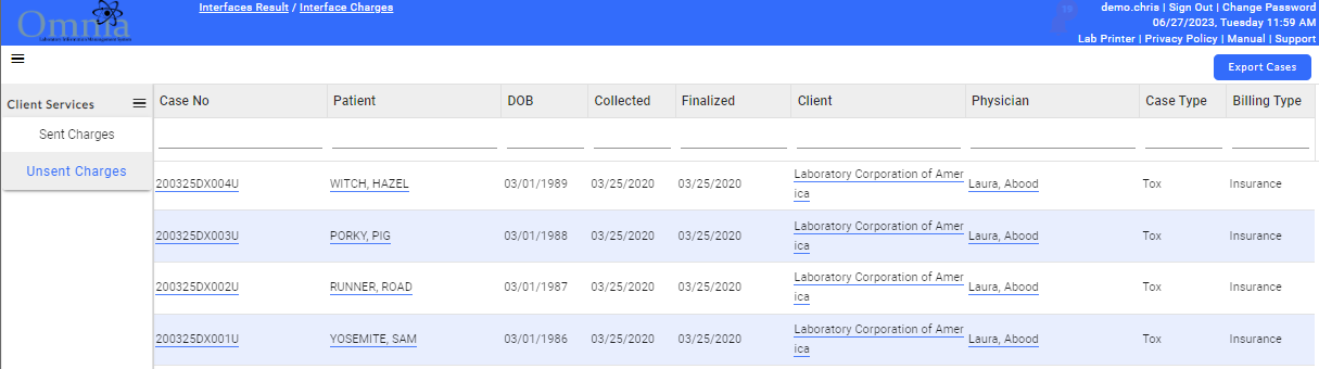 Omnia LIMS is capable of integrating with Omnia Practizing, other billing systems, and with revenue cycle management systems. The Interface Charges page allows authorized Users to: